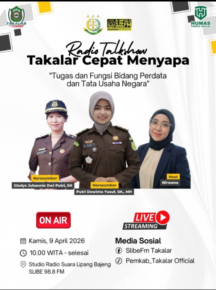 Program siaran langsung tersebut menghadirkan narasumber dari Kejaksaan Negeri Takalar, yakni Kepala Seksi Perdata dan Tata Usaha Negara (Kasi Datun) Putri Dewinta Yusuf, SH., MH., bersama Kasubsi Pertimbangan Hukum Cladys Juhannie Dwi, SH. Talkshow dipandu oleh host Nirwana dan berlangsung di Studio Radio Suara Lipang Bajeng FM yang berada di Kantor Bupati Takalar, di bawah naungan Dinas Kominfo-SP Takalar.